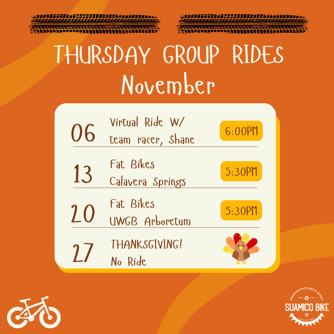 - Location - typically leaving from Suamico Bike Company or local trailhead